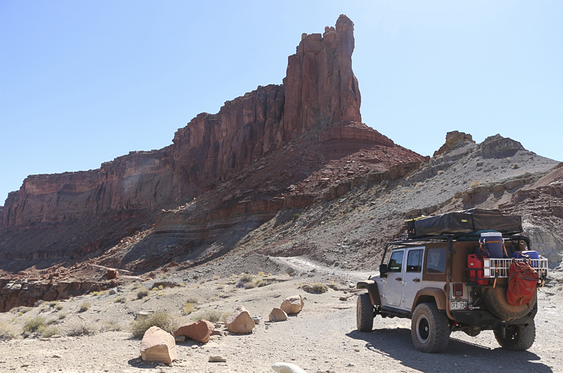 Hinter dem Musselman Arch wird die Piste auch zunehmend rauer, einsamer und anspruchsvoller. Höhepunkt des ersten Tages ist schließlich das tief gelegene Monument Basin mit seiner Phalanx riesiger Felstürme, das man nach einer Fahrstrecke von etwa 30 Meilen (ab Beginn Shafer Trail) erreicht. Da hier der Blick weit nach Osten geht, hat man das beste Fotolicht am späten Nachmittag bzw. gegen Abend.