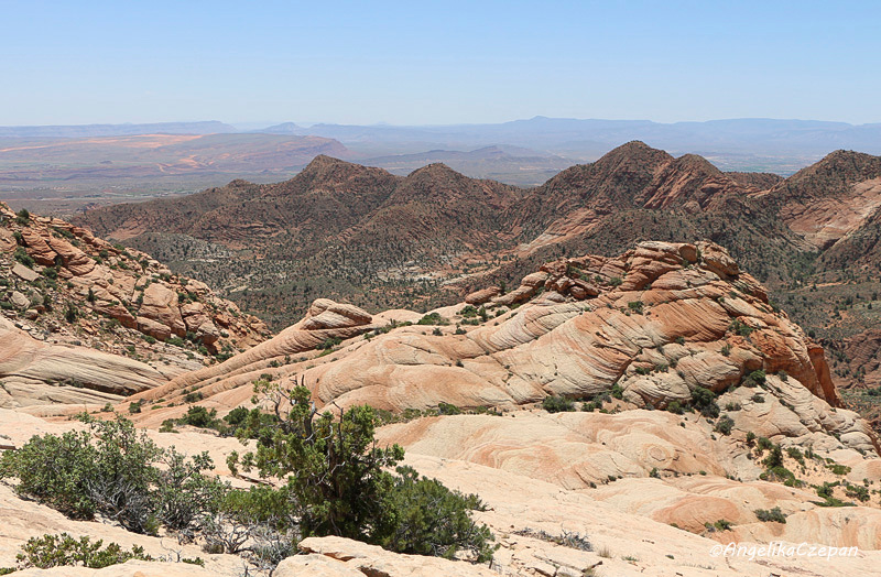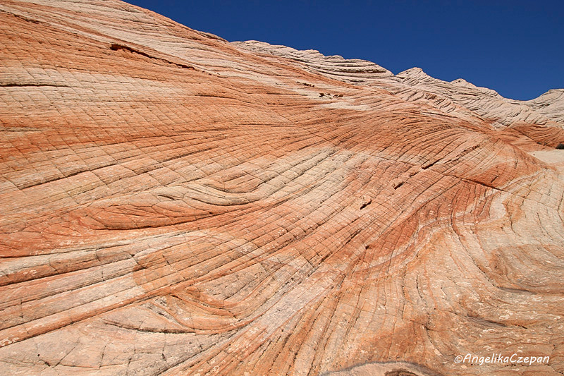 Daher geht man von hier aus etwa 500 Meter querfeldein nach links (Richtung Südosten), wo man einen wesentlich flacheren Einstieg in diese faszinierende Felslandschaft findet (YANT-06). Von hier aus lässt sich das Gebiet mit seinen ineinander verdrehten Sandsteinwellen dann sehr schön erkunden, indem man in einem großen Bogen immer weiter Richtung Osten wandert, vorbei an bunt gestreiften Hügeln mit interessanten Farbmustern (YANT-07), bis man schließlich nach weiteren 0,7 Meilen an einem steilen Dryfall ankommt, an dem es definitiv nicht mehr weiter geht (YANT-08). Das ständige Auf und Ab über die Slickrockhügel kann übrigens ganz schön anstrengend sein, daher sollte man für diese Querfeldeintour ausreichend Wasser mitnehmen und genügend Zeit einplanen. Danach wandert man auf gleichem Weg wieder zurück. Für gute Fotos sollte man die Sandsteinformationen am späten Abend fotografieren, da dann die Strukturen und Farben besser zur Geltung kommen. Bei grellem Tageslicht wirken sie dagegen relativ farblos.