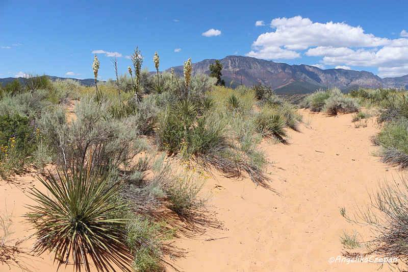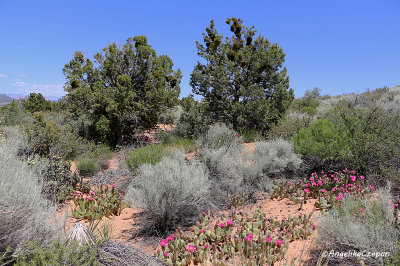 Vom Parkplatz folgt man dem gut erkennbaren schmalen Jeeptrail, der von Felsplatten und Wacholderbüschen gesäumt nach Süden führt. Ein besonderes Erlebnis ist diese Wanderung Ende Mai, wenn rechts und links des Wegs unzählige Wildblumen und Kakteen blühen, die die ansonsten eher karge Wüstenlandschaft in ein buntes Blütenmeer verwandeln. Erst gegen Ende wird der Weg etwas offener und sandiger.