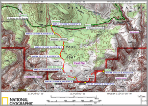 Nach 1,5 Meilen verlässt man die FR032 und biegt nach links ab auf die ebenfalls ungeteerte, nun etwas schmalere FR031, die im weiteren Verlauf am Einschnitt des Big Hollow vorbeiführt und nach 7,3 Meilen einen auf einer Kuppe gelegenen Parkplatz an der FR 903 erreicht. Dies ist der Ausgangspunkt für die Wanderung zu den Yant Flats (YANT-01).