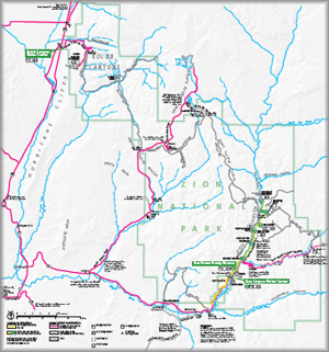 Hinweis: Da es entlang dem Highway 9 durch das hohe Besucheraufkommen im Parkbereich regelmäßig zu langen Wartezeiten und Staus kommt, sollte man - sofern man die Straße nur zur Durchfahrt nutzen möchte - lieber auf die weiter südlich gelegenen Highways 59 und 385 über Hilldale, Colorado City und Fredonia ausweichen. Diese Strecke ist nur unwesentlich länger und man erspart sich damit auch die relativ hohe Eintrittsgebühr in den Park!