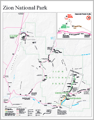 Drei von Quellen gespeiste Pools, kleine Wasserfälle und schöne Ausblicke auf den Zion Canyon machen diese Tour zu einer der schönsten und damit leider auch zu einer der am meisten frequentierten Wanderungen innerhalb des Parks. Der Weg beginnt gegenüber der Zion Lodge. Man überquert eine Fußbrücke und nimmt den geteerten Weg nach rechts zu den Lower Emerald Pools. Von dort sind es nur 0,2 Meilen bis zu dem etwas oberhalb gelegenen Middle Pool. Unterwegs führt ein steiler Weg von 0,3 Meilen bis zum Upper Emerald Pool mit feinen weißen Sandbänken unter steil aufragenden Felswänden.